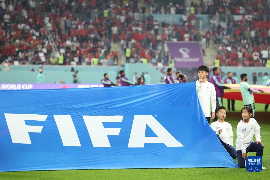 金粲璨(右二)在卡塔尔世界杯三、四名决赛开赛前作为护旗手出场(12月17日摄)。