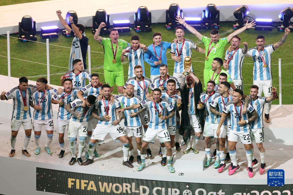 12月18日,阿根廷队球员在颁奖仪式上庆祝夺冠。
