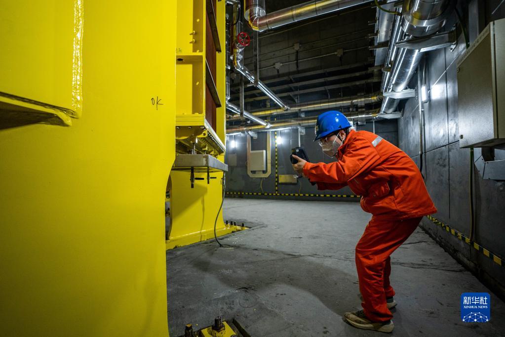 12月19日,在白鹤滩水电站右岸地下厂房,工作人员在检查发电机升温情况。