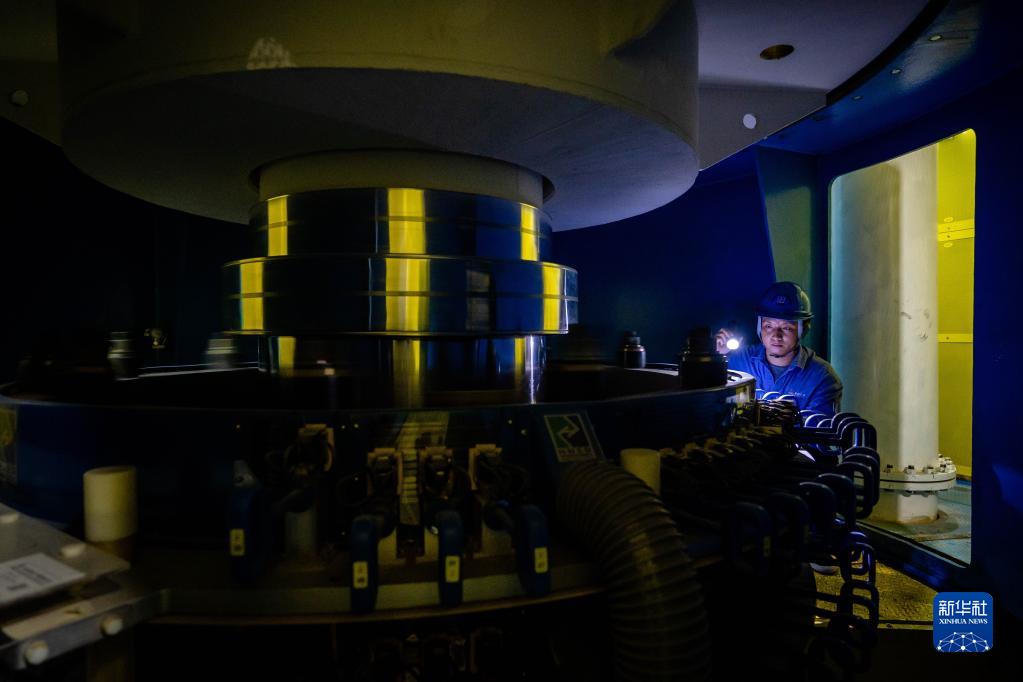 12月19日,在白鹤滩水电站右岸地下厂房,工作人员在检查集电环运转情况。