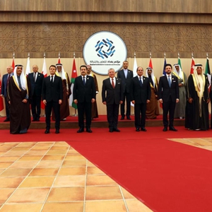 12月20日,在位于约旦死海畔的约旦侯赛因国王会议中心,伊拉克总理苏达尼(左一)、约旦国王阿卜杜拉二世(左二)、埃及总统塞西(左三)等与会嘉宾合影。