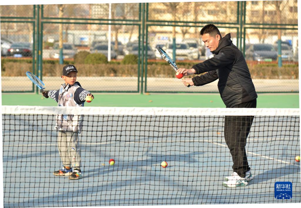 12月21日,一名儿童在石家庄市高铁片区中央绿色体育公园学习打网球。