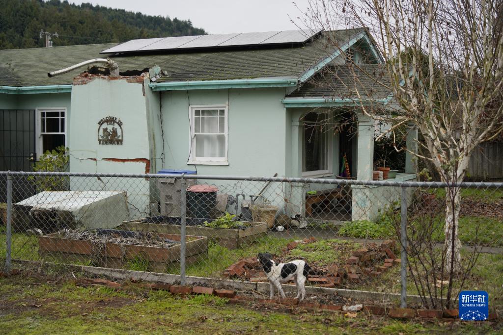 12月21日,在美国加利福尼亚州北部芬代尔,一只狗站在被地震损坏的房屋前。