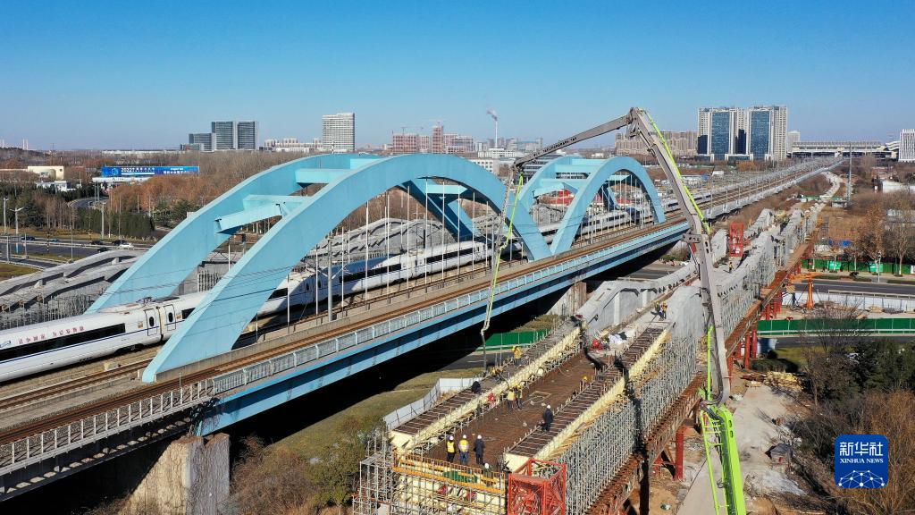 12月22日,中铁十局的工作人员在对济郑高铁跨济南经十西路槽型梁进行合龙作业(无人机照片)。