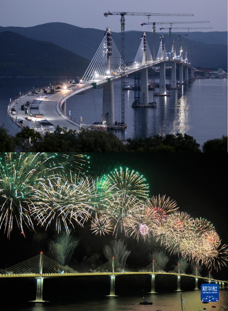 下图:这是2022年7月26日在克罗地亚科马尔纳拍摄的佩列沙茨大桥通车仪式上的焰火表演。新华社记者 李学军 摄