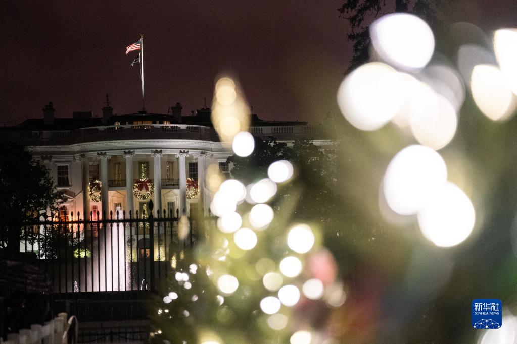 这是12月22日在美国华盛顿拍摄的圣诞树装饰掩映下的白宫。