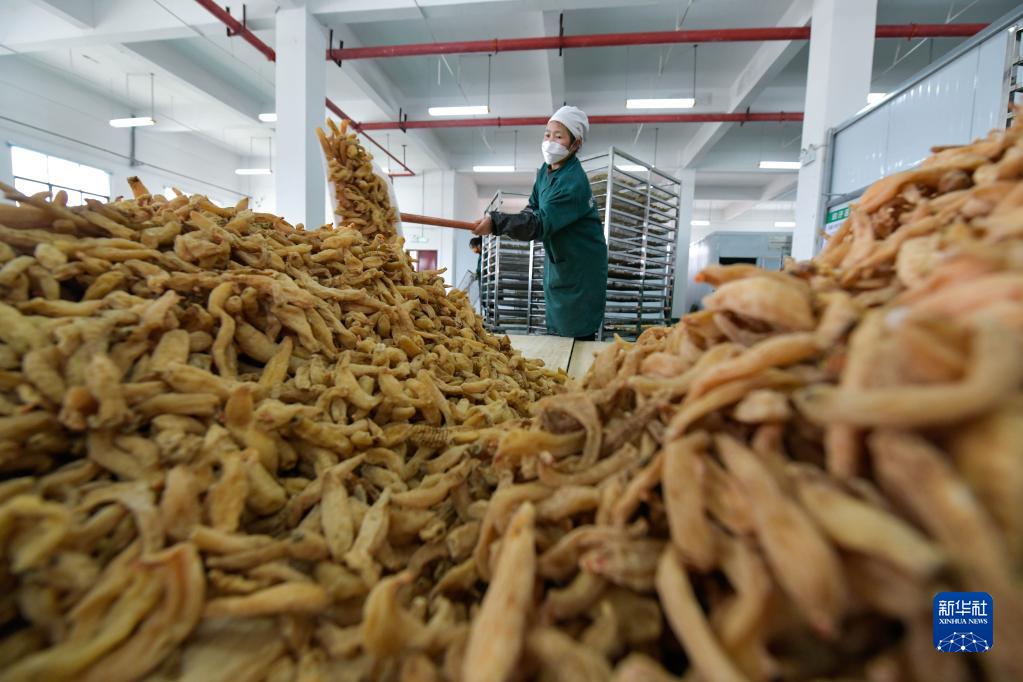 12月22日,在贵州省黎平青江农业开发有限公司,工人将天麻堆放在一起,为分级作准备。