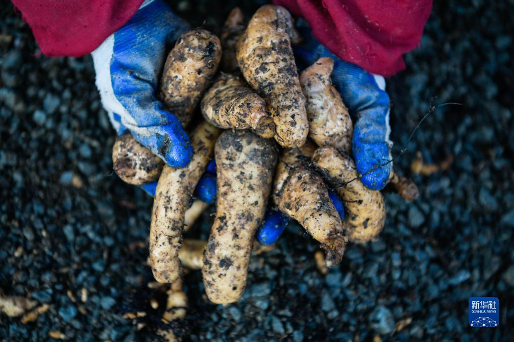 12月21日,农民在贵州省黎平县九潮镇万宝山天麻种植基地采收天麻。