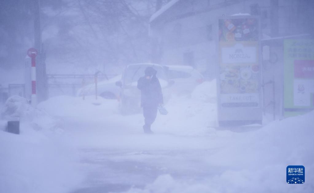 12月23日,行人在日本山形县山形市藏王温泉冒雪前行。