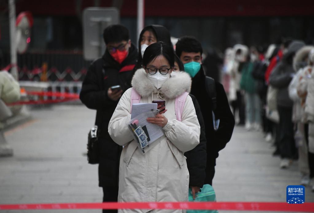 12月24日,在北京外国语大学考点,考生排队准备进入考场。
