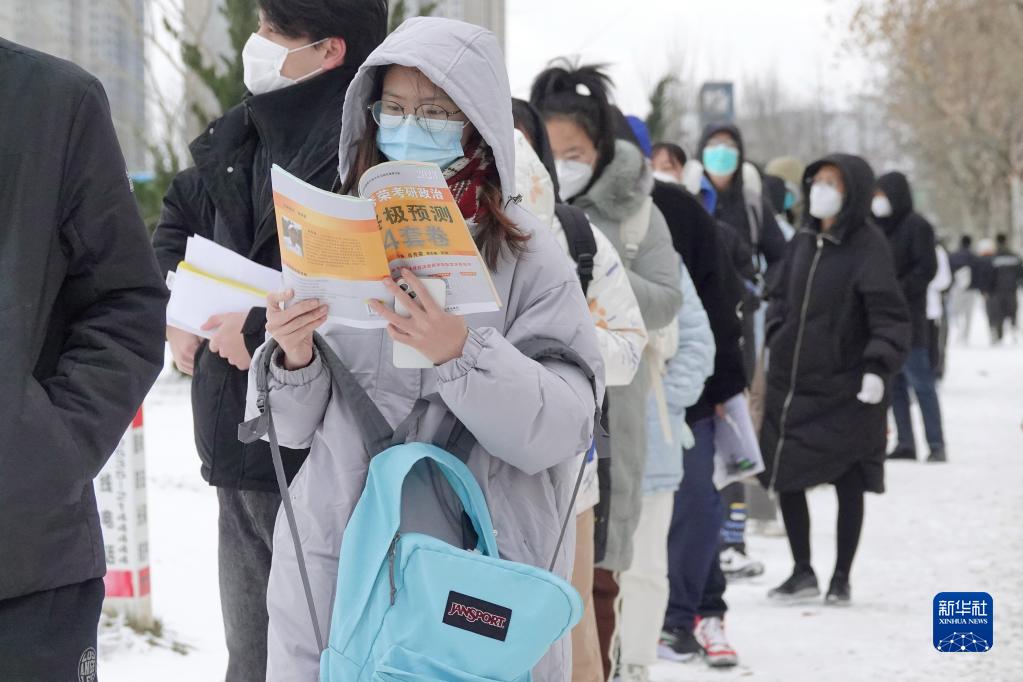 12月24日,在山东莱山一中考点外,考生排队时抓紧复习。