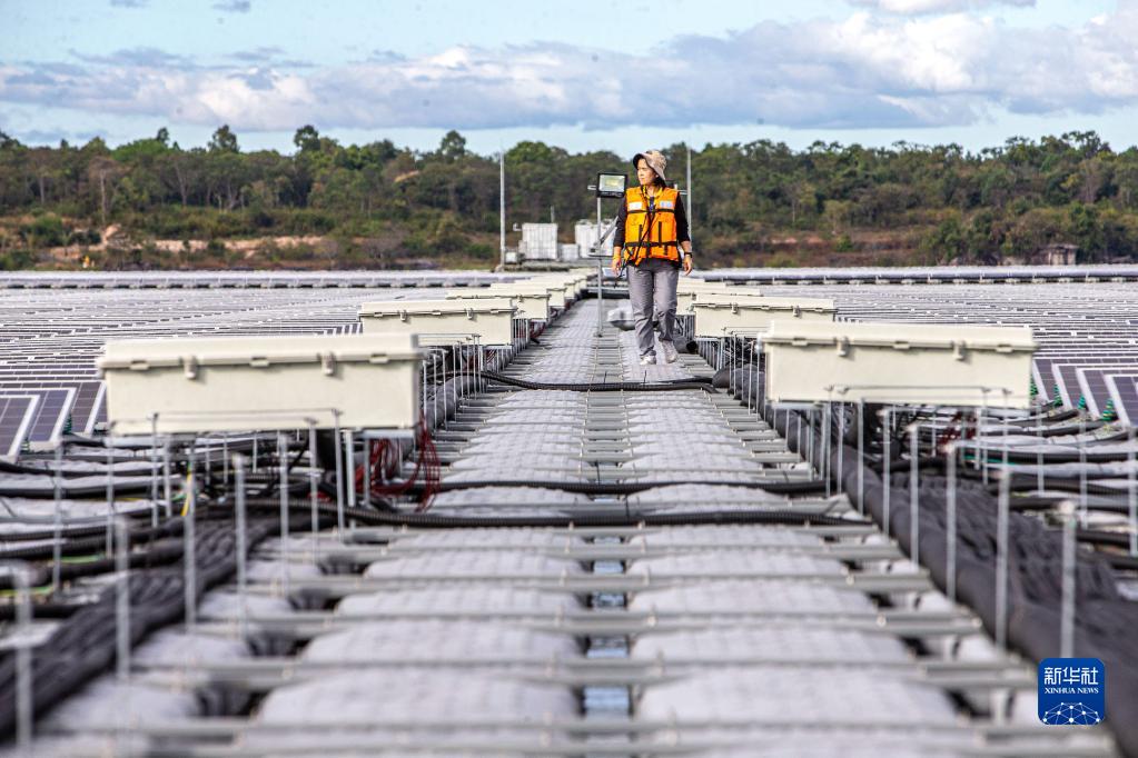 12月8日,一名工作人员在泰国乌汶府诗琳通水库巡查浮体光伏项目。