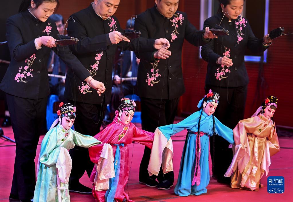 2022年3月4日,陕西省合阳县线腔木偶剧团的演员在合阳县文化馆演艺厅内为观众表演提线木偶剧《闹春》。近年来,陕西省合阳县积极出台扶持政策,在当地开展“非遗进校园”、恢复传统剧目演出、开设免费“周末剧场”等方式,让居民领略传统非遗的魅力,支持合阳提线木偶焕发生机与活力。