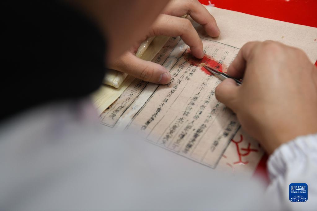 2022年10月20日,在安徽中医药大学图书馆古籍部,古籍修复师茆可人进行古籍修复。作为第三批“全国古籍重点保护单位”,安徽中医药大学图书馆不断推进中医古籍传承和保护工作,目前藏有古籍3.3万余册。近年来,图书馆运用数字化手段,使中医古籍更好服务中医药教学、科研及医疗。