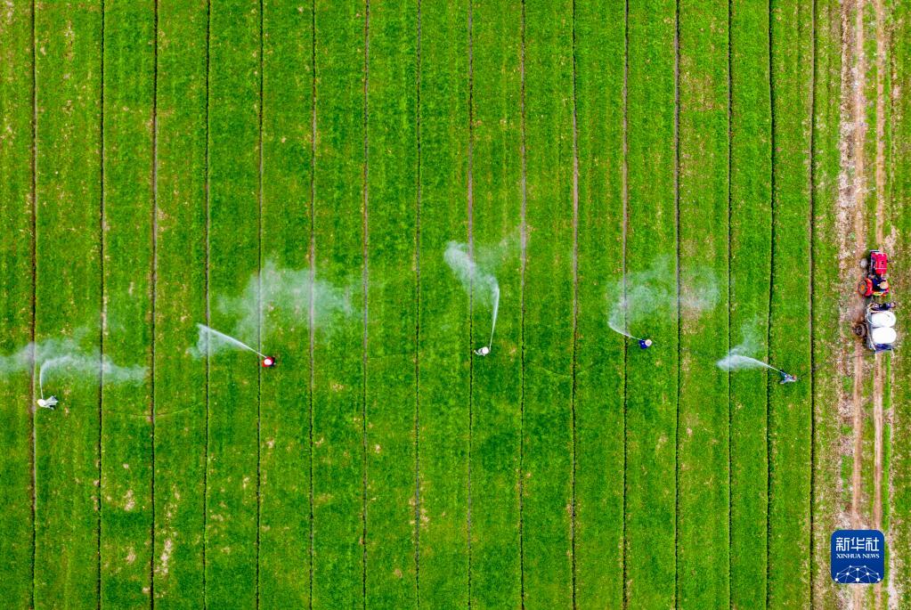 2月16日,安徽省庐江县白湖镇农民在进行小麦病虫害防治作业(无人机照片)。