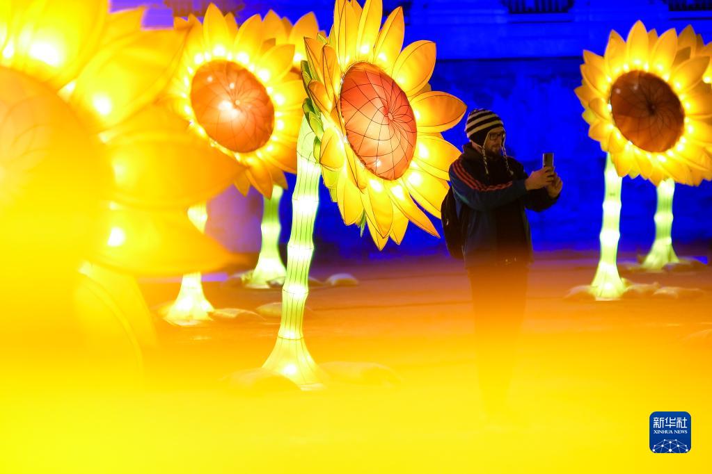 2月10日,一名男子在比利时布鲁塞尔欣赏一处灯光艺术作品。