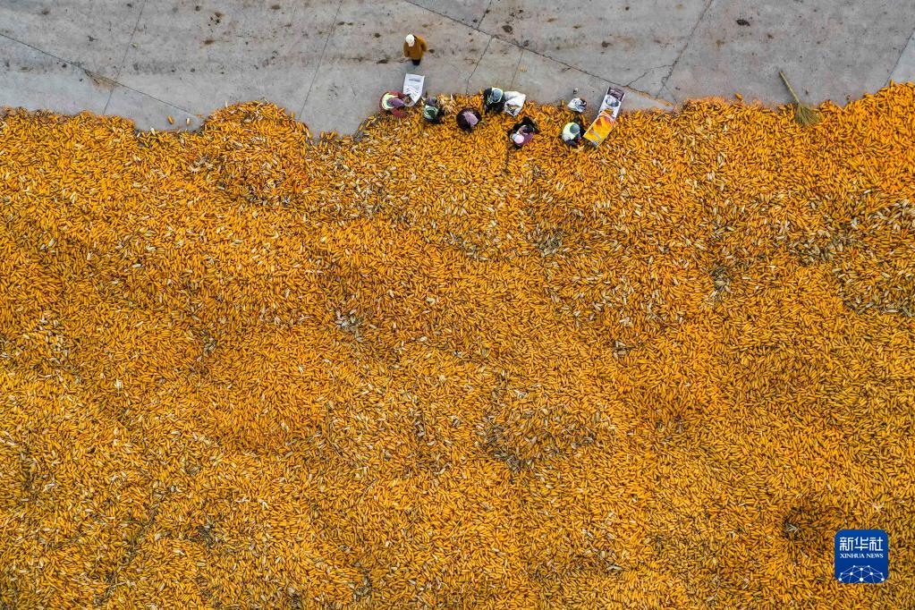 11月1日,农民在吉林省公主岭市环岭街道土城子村志和农机服务专业合作社内分拣收获的玉米,准备进行下一步的储存工作(无人机照片)。