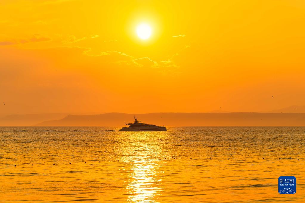 这是7月6日在俄罗斯符拉迪沃斯托克拍摄的落日余晖中的游艇。