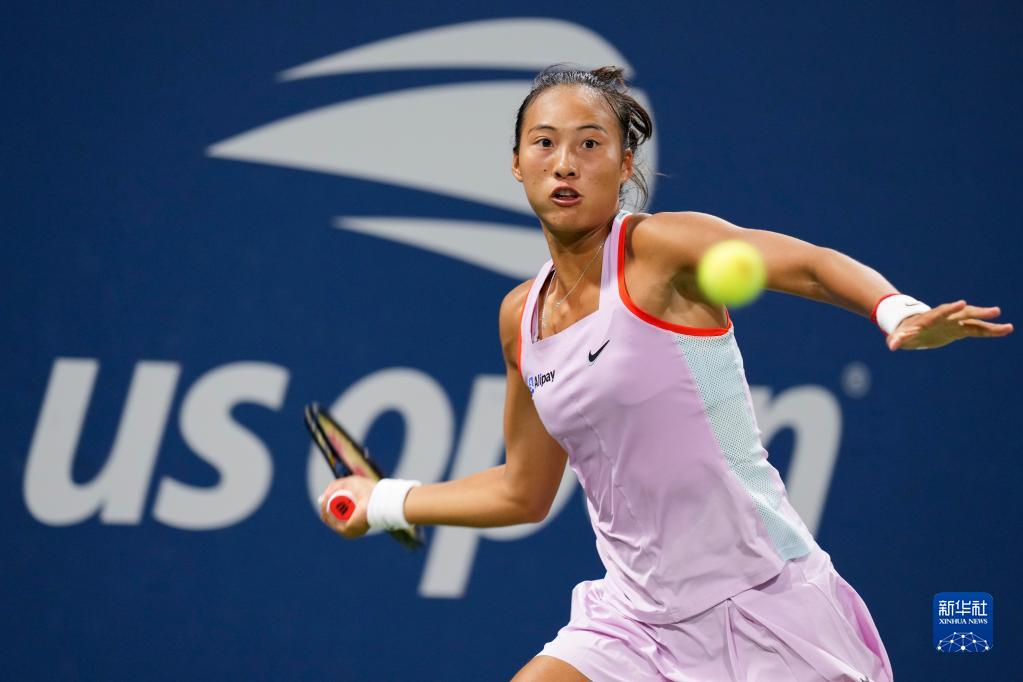 这是2022年9月3日,郑钦文在2022美国网球公开赛女子单打第三轮对阵德国选手尼迈尔的比赛中回球。