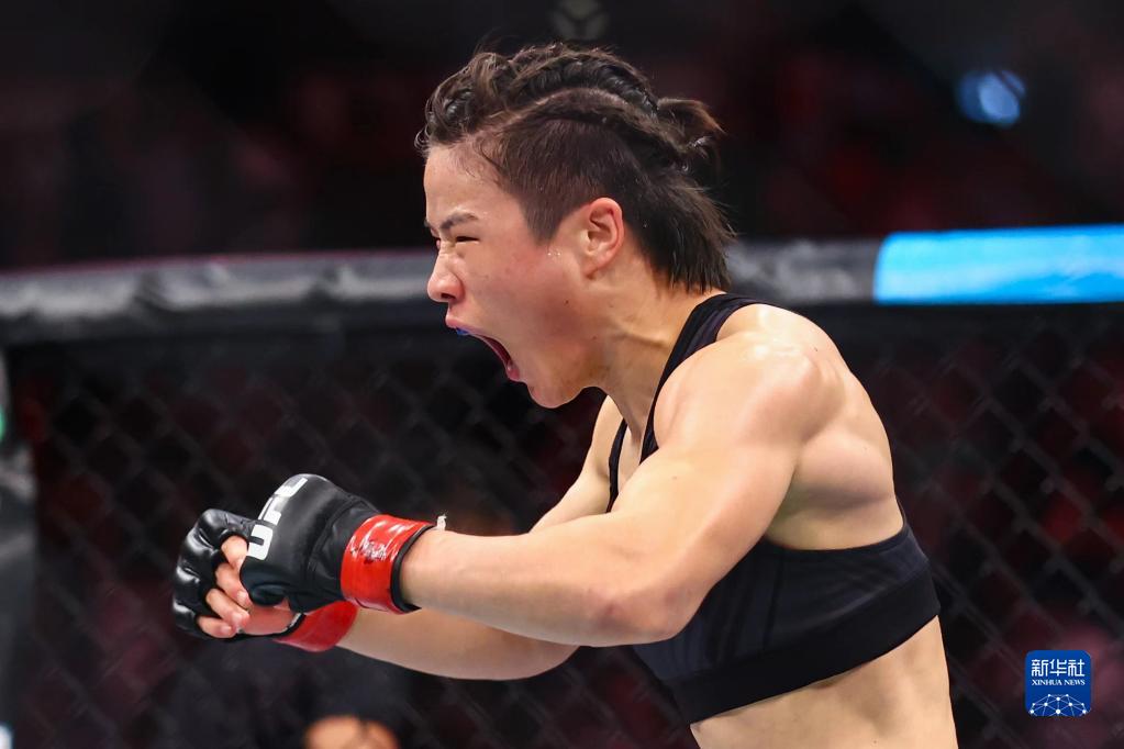 这是2022年6月12日,张伟丽在新加坡举行的终极格斗冠军赛UFC275对阵波兰选手乔安娜·耶德尔泽西克的比赛后庆祝胜利。