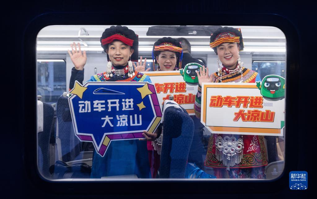 12月26日,彝族群众身着节日的盛装在新成昆铁路首发列车上招手。