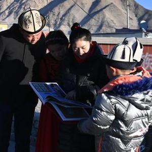 在新疆克孜勒苏柯尔克孜自治州阿克陶县布伦口乡,李文娟(中)和同事们召开专题讨论会,学习党的二十大精神(12月16日摄)。