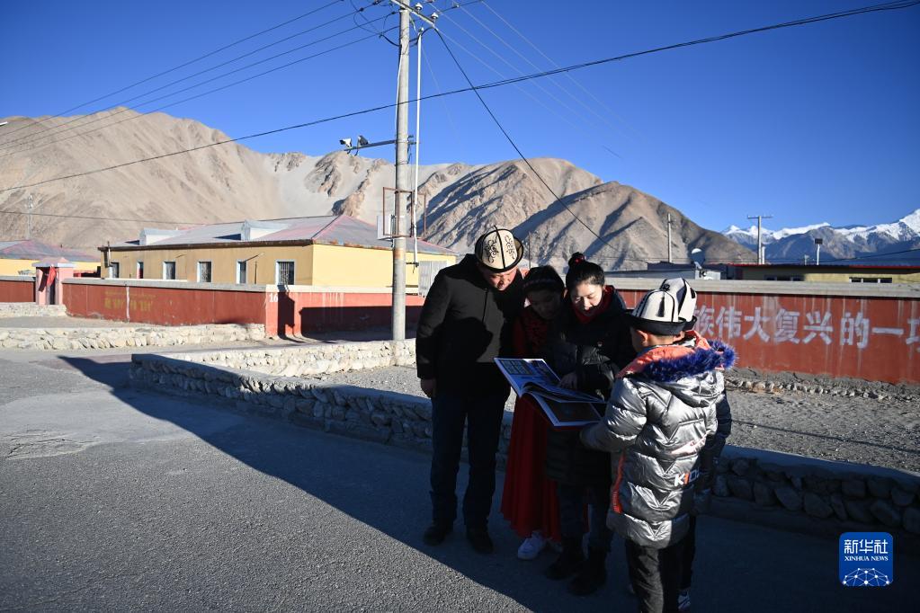 在新疆克孜勒苏柯尔克孜自治州阿克陶县布伦口乡布伦口村,李文娟(中)向当地村民宣讲党的二十大精神(12月17日摄)。