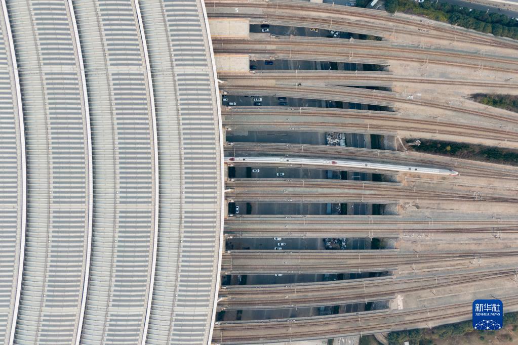 12月26日,一列动车组列车驶出武汉站(无人机照片)。