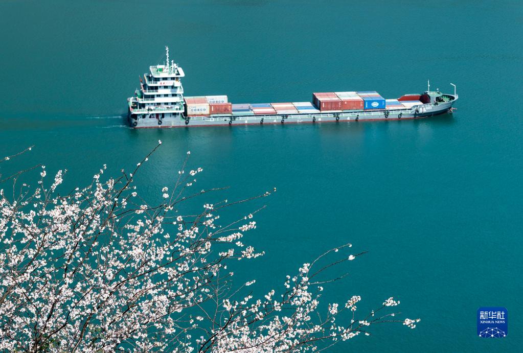 一艘货船行驶在春花掩映下的长江三峡湖北省宜昌市秭归县水域(2022年3月8日摄)。