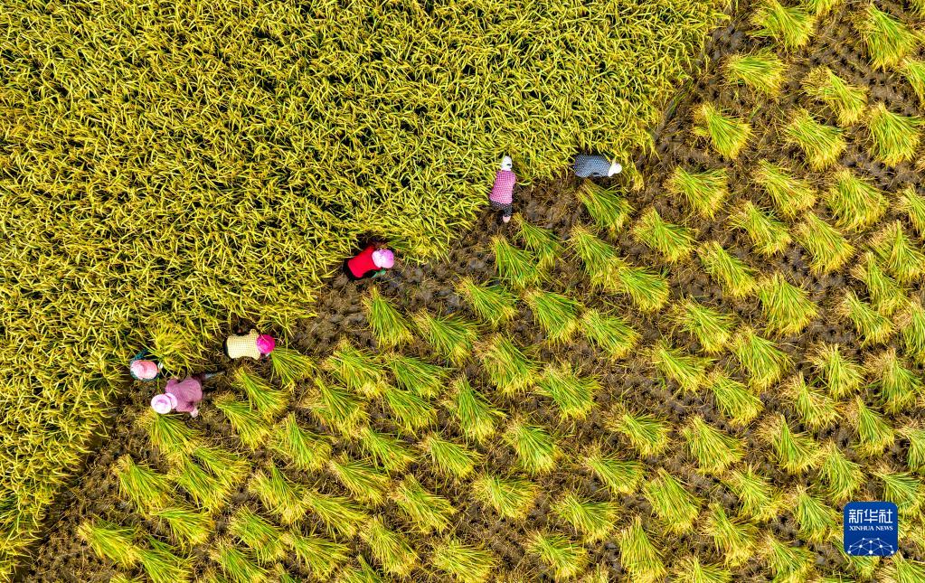 秋收时节,在安徽省合肥市庐江县白湖镇,农民在田间收割水稻(2022年9月13日摄,无人机照片)。
