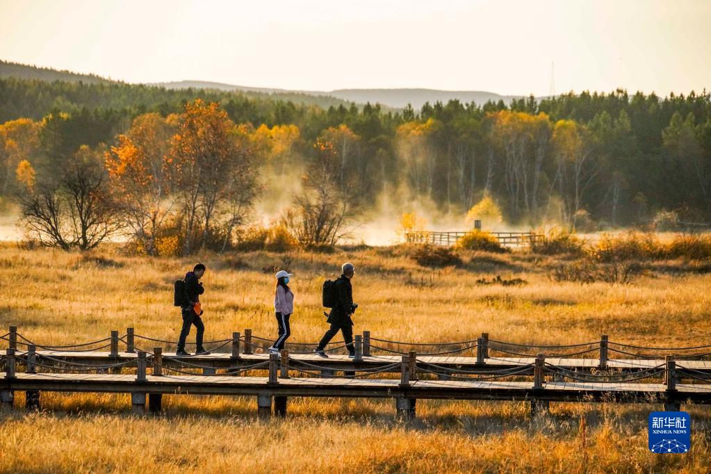 游客在位于承德市的河北省塞罕坝国家森林公园欣赏秋日晨景(2022年9月29日摄)。
