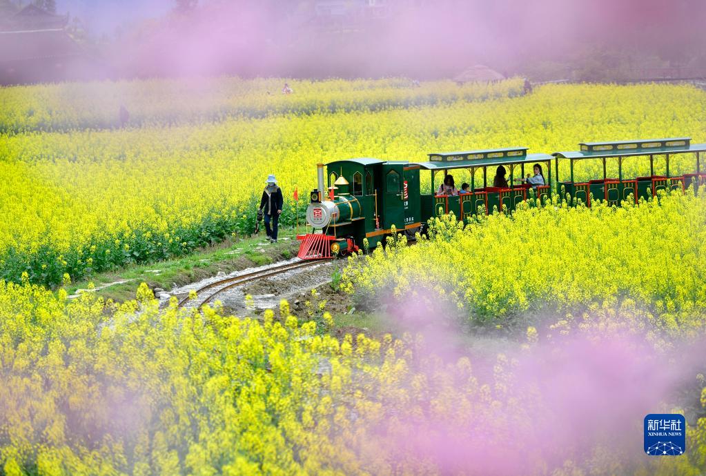 游客乘坐“小火车”在湖北省恩施土家族苗族自治州宣恩县的油菜花田中欣赏春光(2022年3月18日摄)。