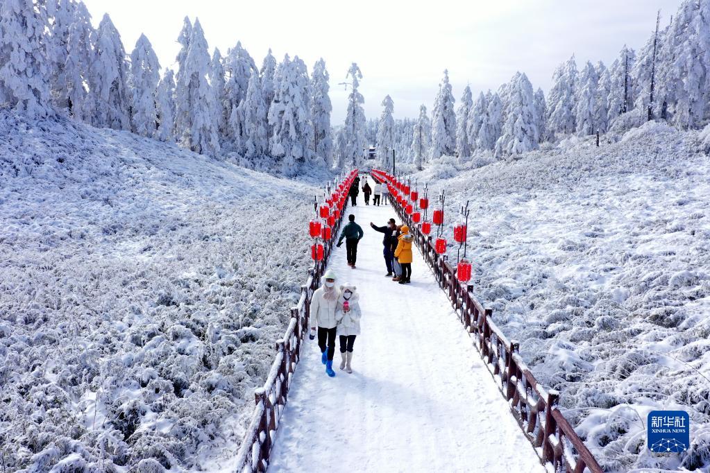游客在四川省眉山市洪雅县瓦屋山游玩赏雪(2022年12月18日摄,无人机照片)。