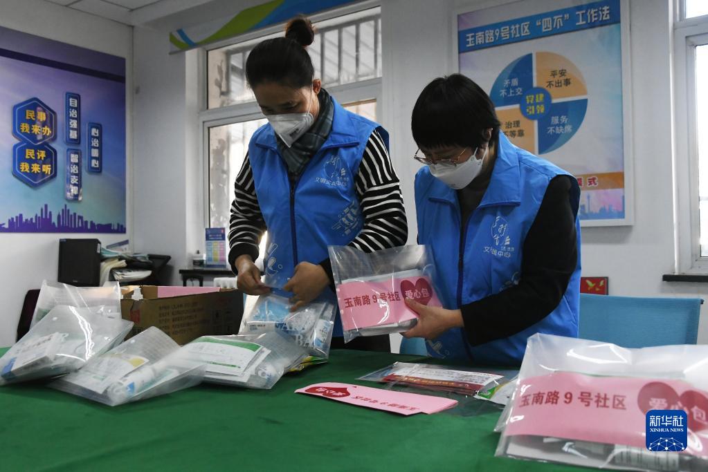 12月27日,在北京市海淀区羊坊店街道玉南路9号社区居委会,社区工作人员在装“防疫爱心包”。