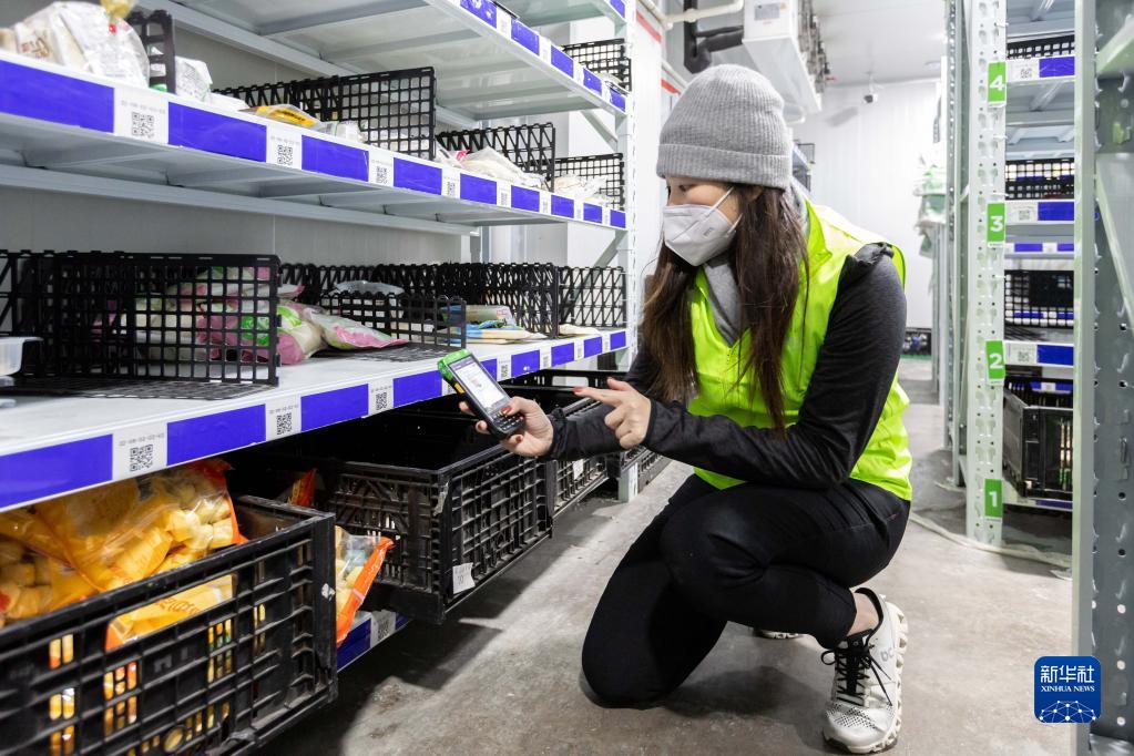 12月27日,在上海市徐汇区的美团买菜前置仓,青年突击队队员根据设备提示,找到对应的库位,扫码确认。