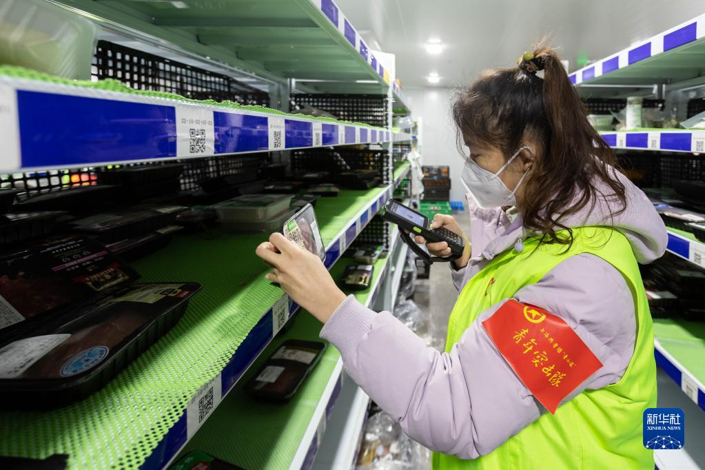 12月27日,在上海市徐汇区的美团买菜前置仓,青年突击队队员扫码商品条形码,确定商品是否匹配。
