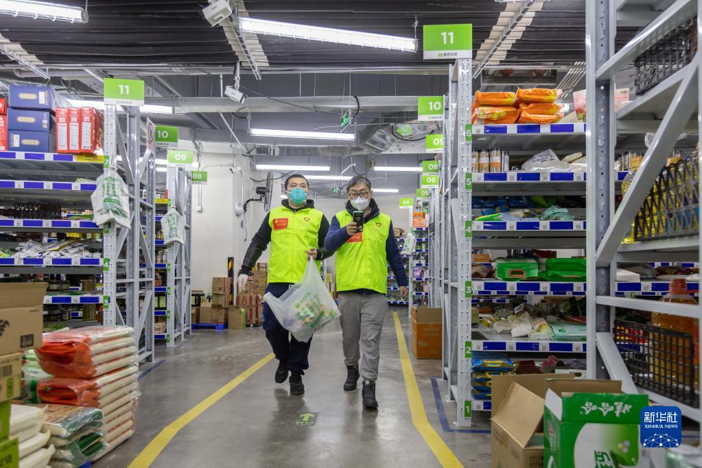 12月27日,在上海市徐汇区的美团买菜前置仓,青年突击队队员进行分拣工作。