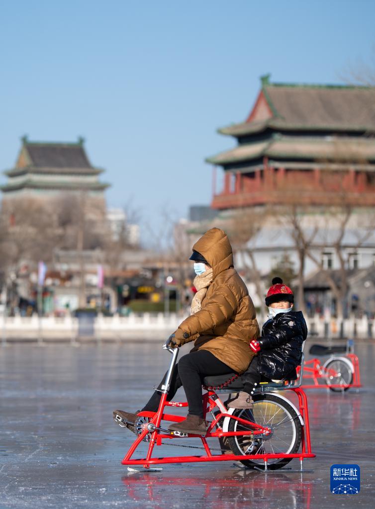 12月27日,家长带着小朋友在北京什刹海冰场上骑冰上自行车。