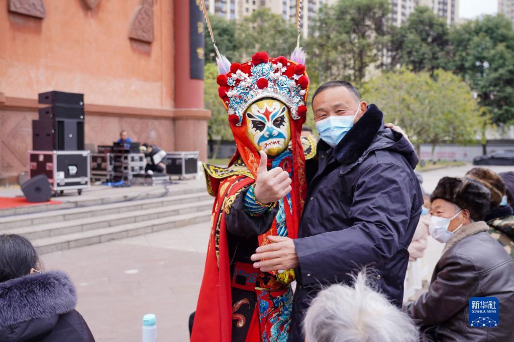 12月27日,在眉山市彭山区观音街道龙门桥社区,演员与观众互动。