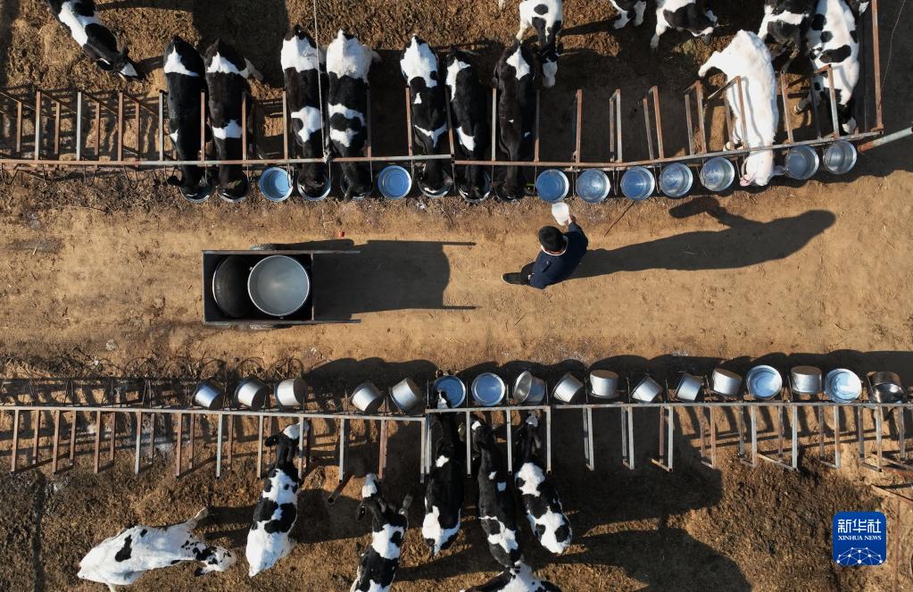 12月28日,程鹏飞在牛舍喂牛(无人机照片)。
