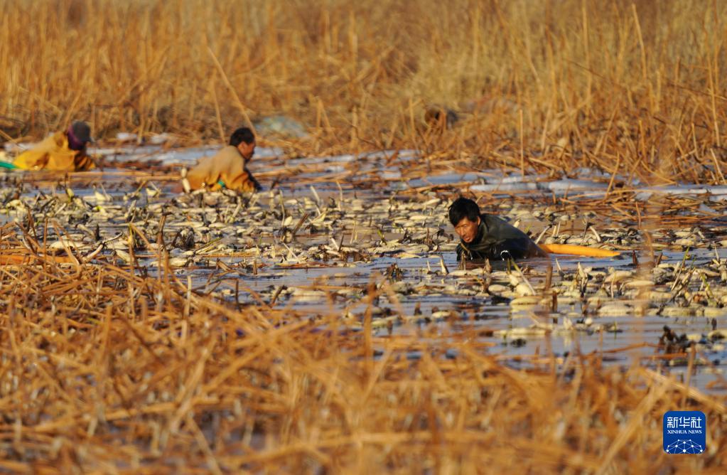 寒冬时节,在河北省邢台市新河县新河镇白穴口村莲藕种植基地,农民们忙着采挖莲藕供应两节市场。