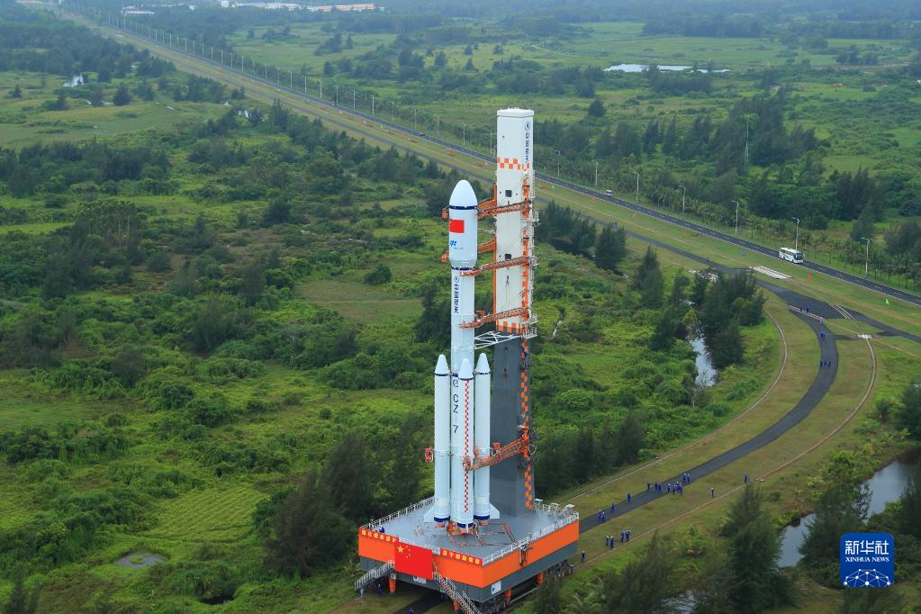 5月7日,天舟四号货运飞船与长征七号遥五运载火箭组合体在垂直转运。 新华社发(杨志远 摄)