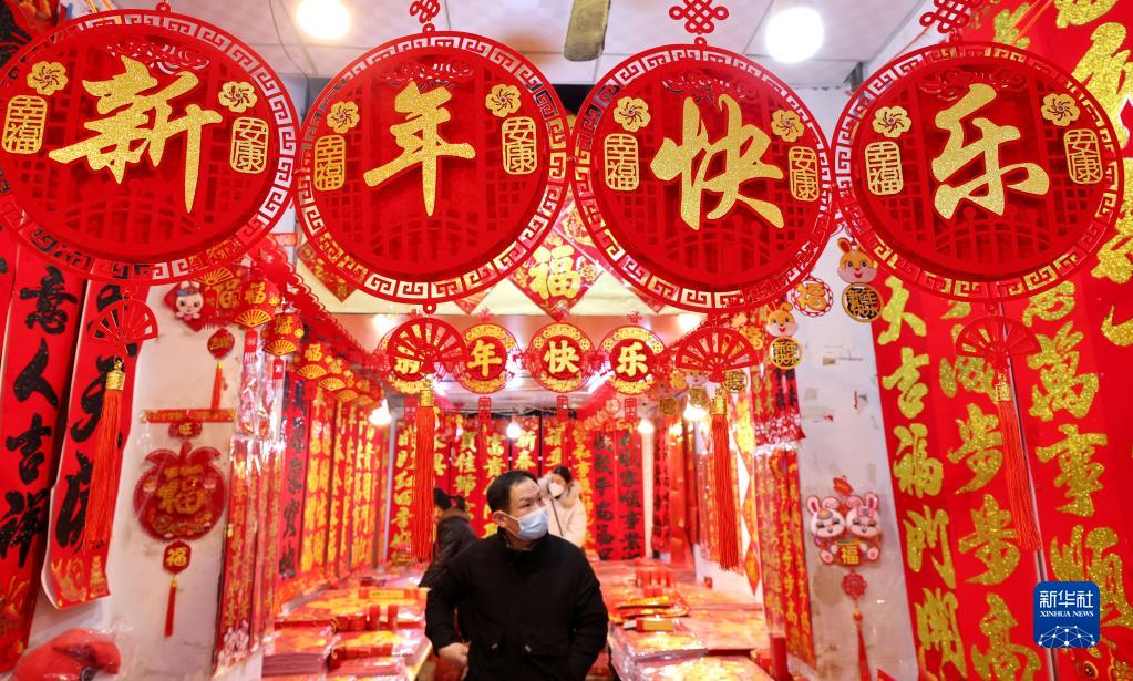 12月29日,在山东省枣庄市一处年货市场内,人们选购新年饰品。