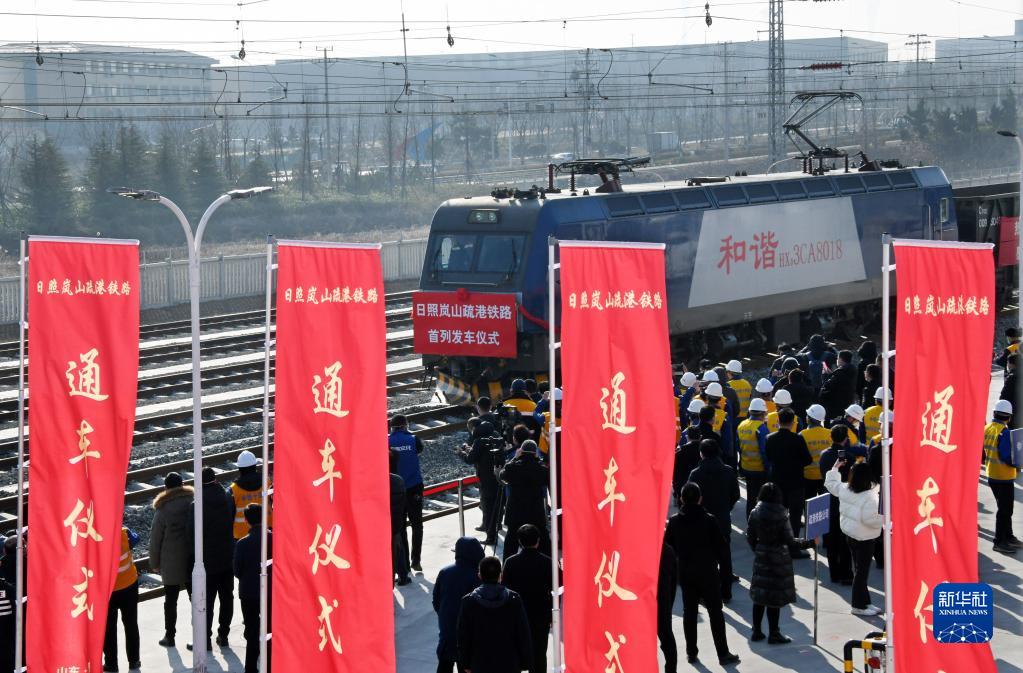 12月29日,在日照岚山疏港铁路山钢站,首列货运列车经过通车仪式现场。