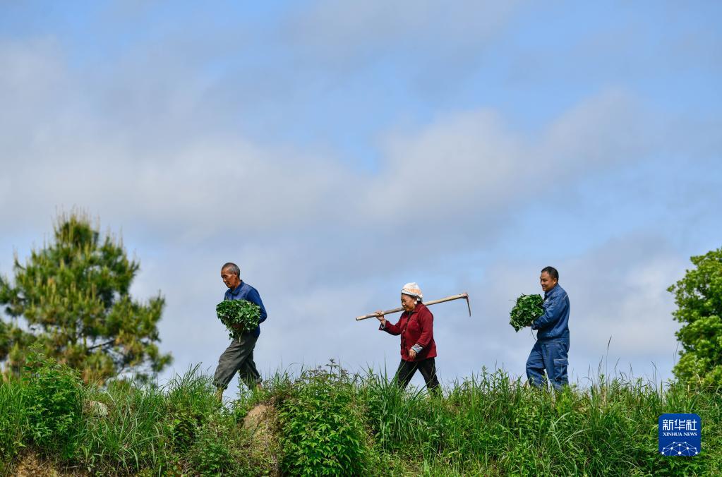 刘开福(右)与村民搬运即将移栽的紫薯苗(2022年5月10日摄)。