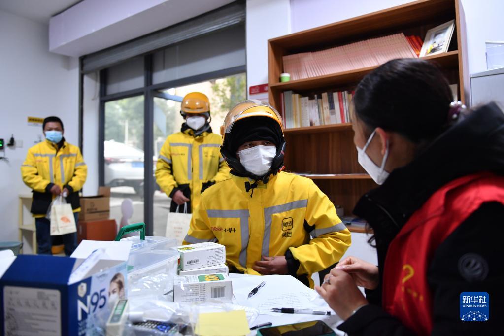 12月29日,在长沙市天心区文源街道天鸿社区的“红色之家”,外卖骑手排队领取药品。