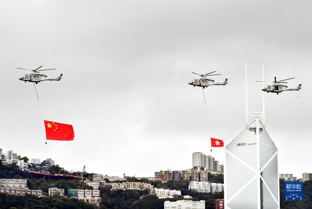 2022年7月1日,香港特区政府在金紫荆广场举行升旗仪式,庆祝香港回归祖国25周年。这是分别悬挂中华人民共和国国旗、香港特区区旗的直升机从空中飞过。新华社记者 卢炳辉 摄