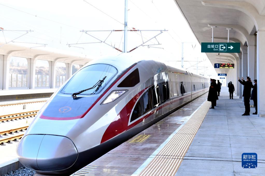 12月30日,在济(南)莱(芜)高铁雪野站,复兴号列车驶出站台。