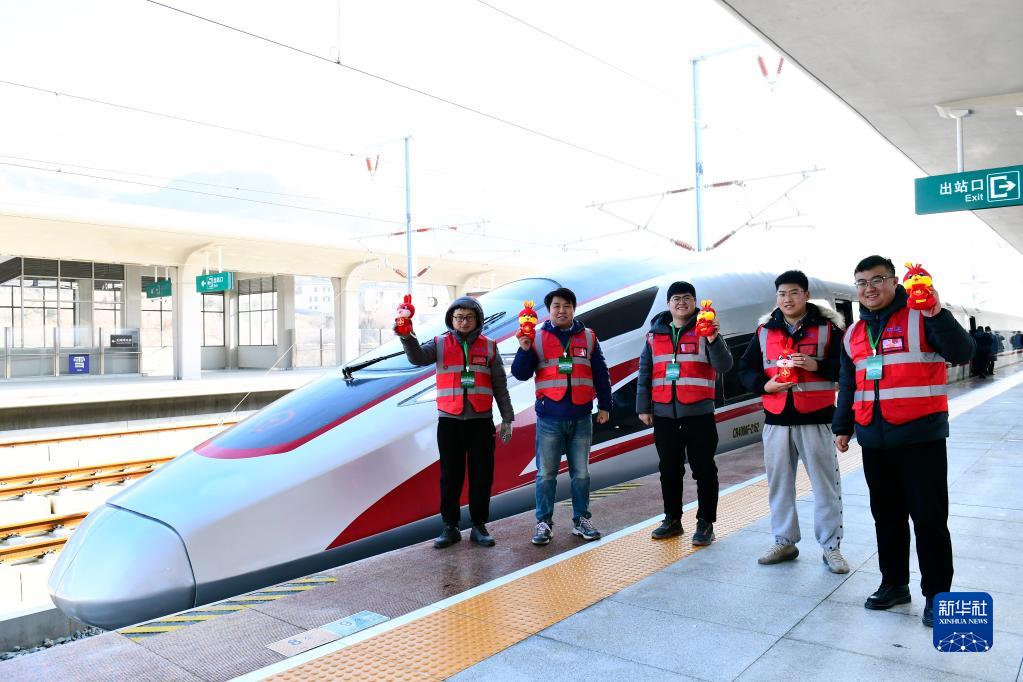 12月30日,在济(南)莱(芜)高铁雪野站,参建单位代表在列车开行前合影留念。