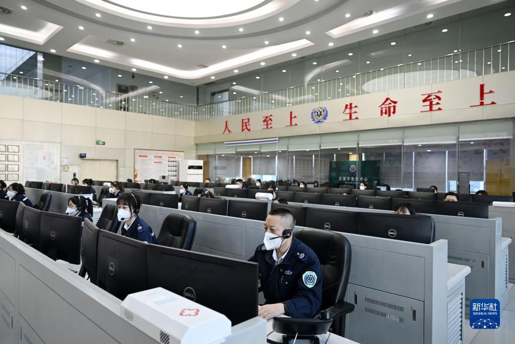 在天津市急救中心通讯调度大厅内,调度员在紧张工作(12月29日摄)。新华社记者 赵子硕 摄